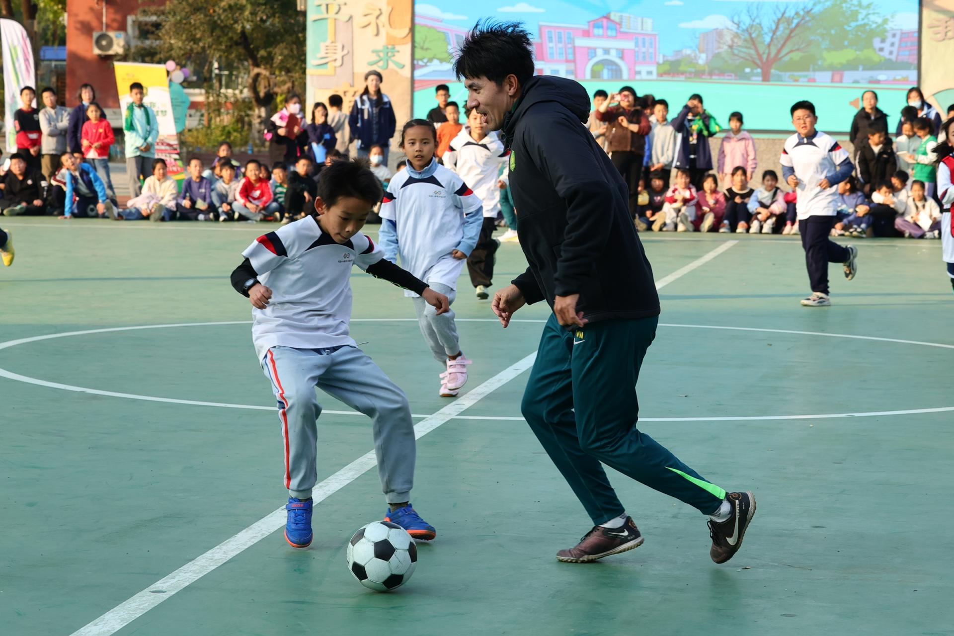 During the halftime breaks of Chinese Super League matches, primary school students showcased their shooting skills on the professional pitch of Beijing Workers' Stadium. On the stands of the China Open, a primary school PE teacher took advantage of the breaks between matches to explain the history of tennis and its scoring rules to the students watching the game.