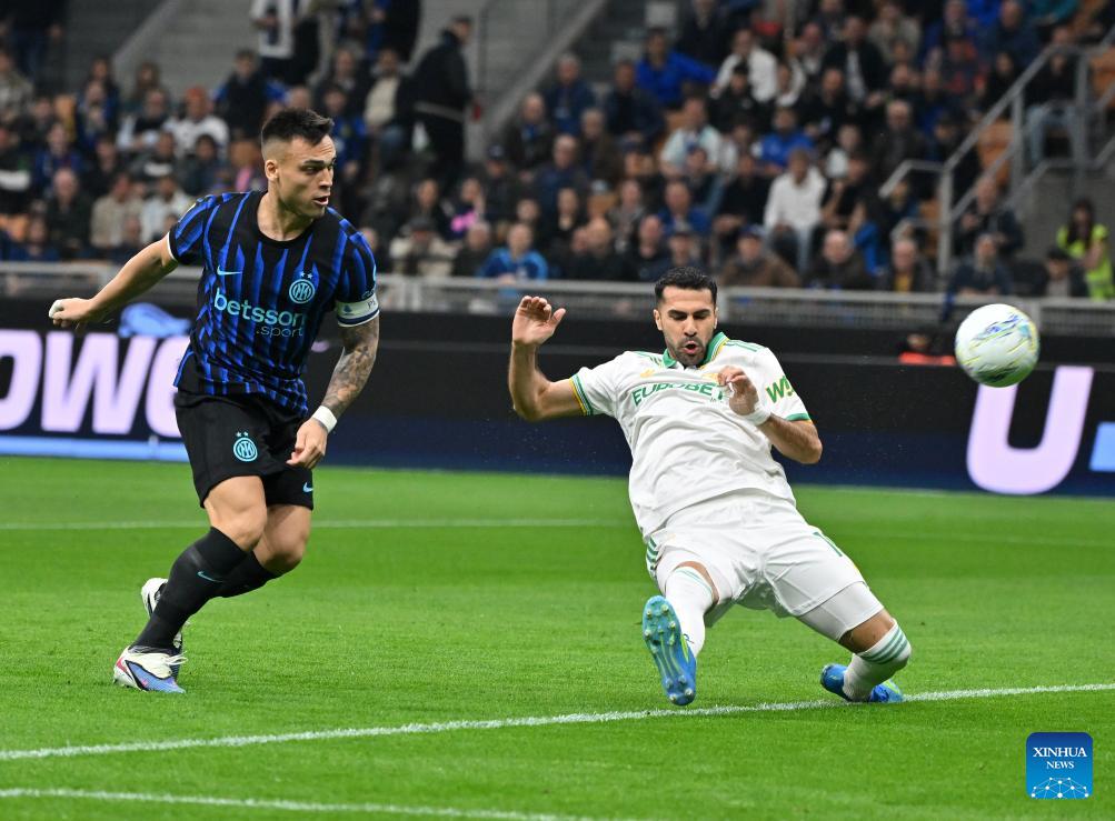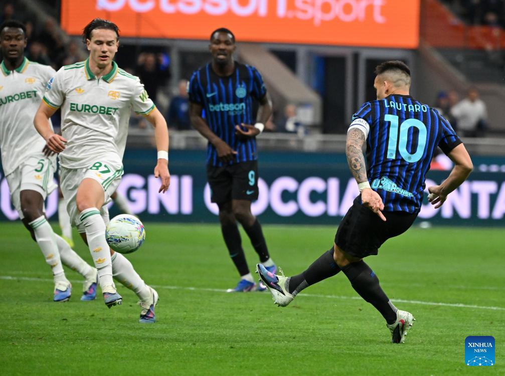 Inter Milan's Lautaro Martinez (L) scores during a Serie A football match between Inter Milan and Roma in Milan, Italy, April 5, 2026. (Photo by Alberto Lingria/Xinhua)