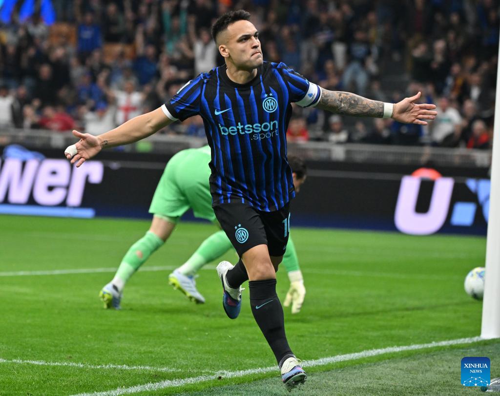 Inter Milan's Lautaro Martinez celebrates his goal during a Serie A football match between Inter Milan and Roma in Milan, Italy, April 5, 2026. (Photo by Alberto Lingria/Xinhua)