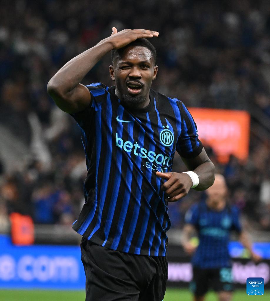 Inter Milan's Marcus Thuram celebrates his goal during a Serie A football match between Inter Milan and Roma in Milan, Italy, April 5, 2026. (Photo by Alberto Lingria/Xinhua)