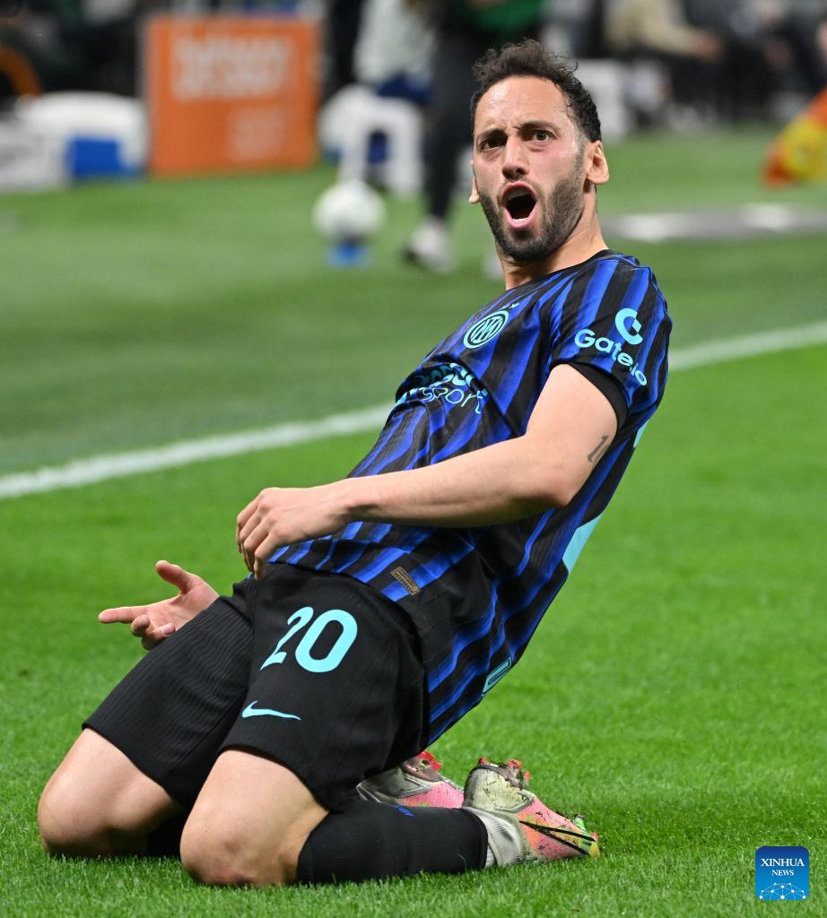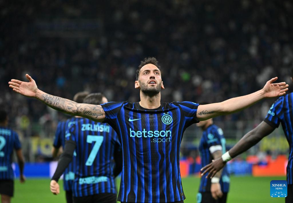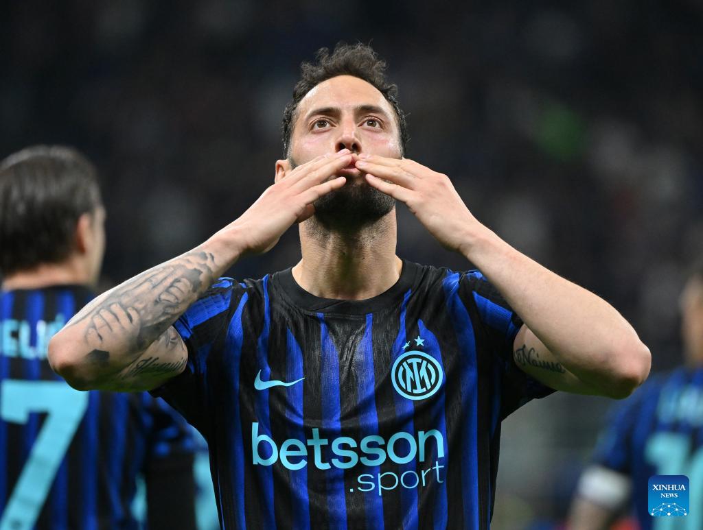 Inter Milan's Hakan Calhanoglu celebrates his goal during a Serie A football match between Inter Milan and Roma in Milan, Italy, April 5, 2026. (Photo by Alberto Lingria/Xinhua)