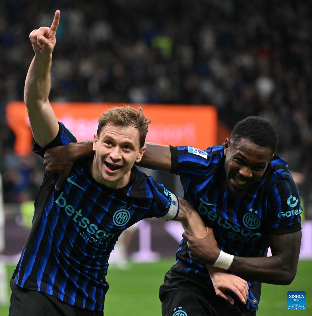 Inter Milan's Nicolo Barella (L) celebrates his goal with his teammate Marcus Thuram during a Serie A football match between Inter Milan and Roma in Milan, Italy, April 5, 2026. (Photo by Alberto Lingria/Xinhua)