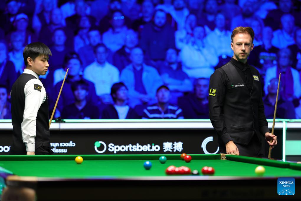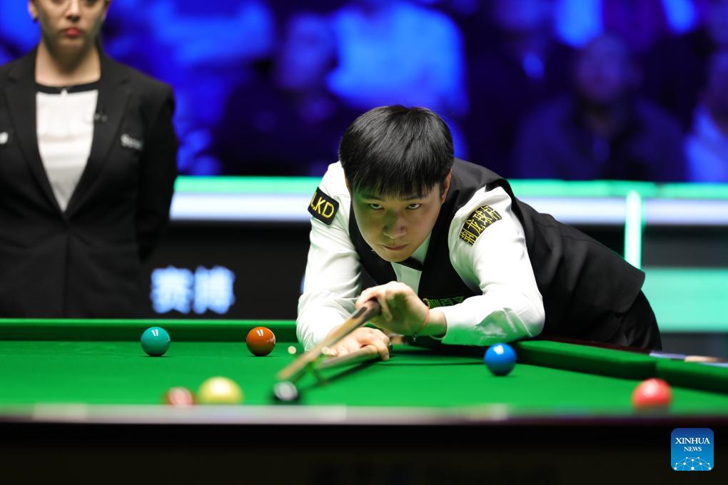 Zhao Xintong (C) of China competes during the final between Zhao Xintong of China and Judd Trump of England at the 2026 Snooker Tour Championship in Manchester, Britain, April 5, 2026. (Photo by Zhai Zheng/Xinhua)