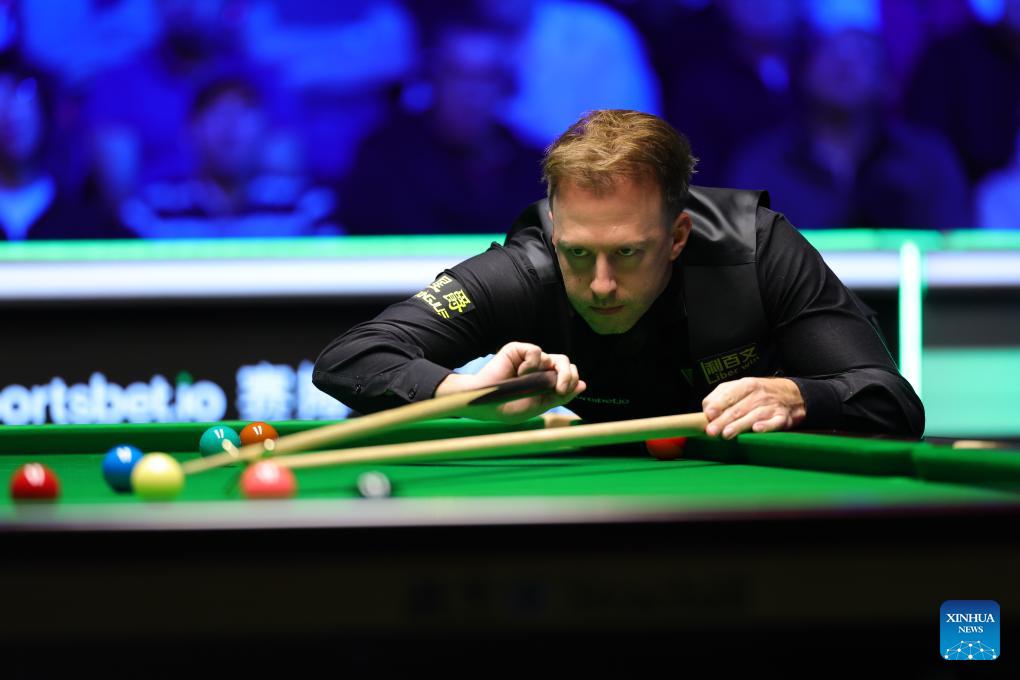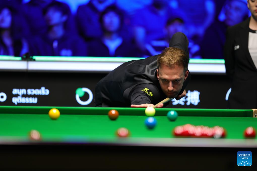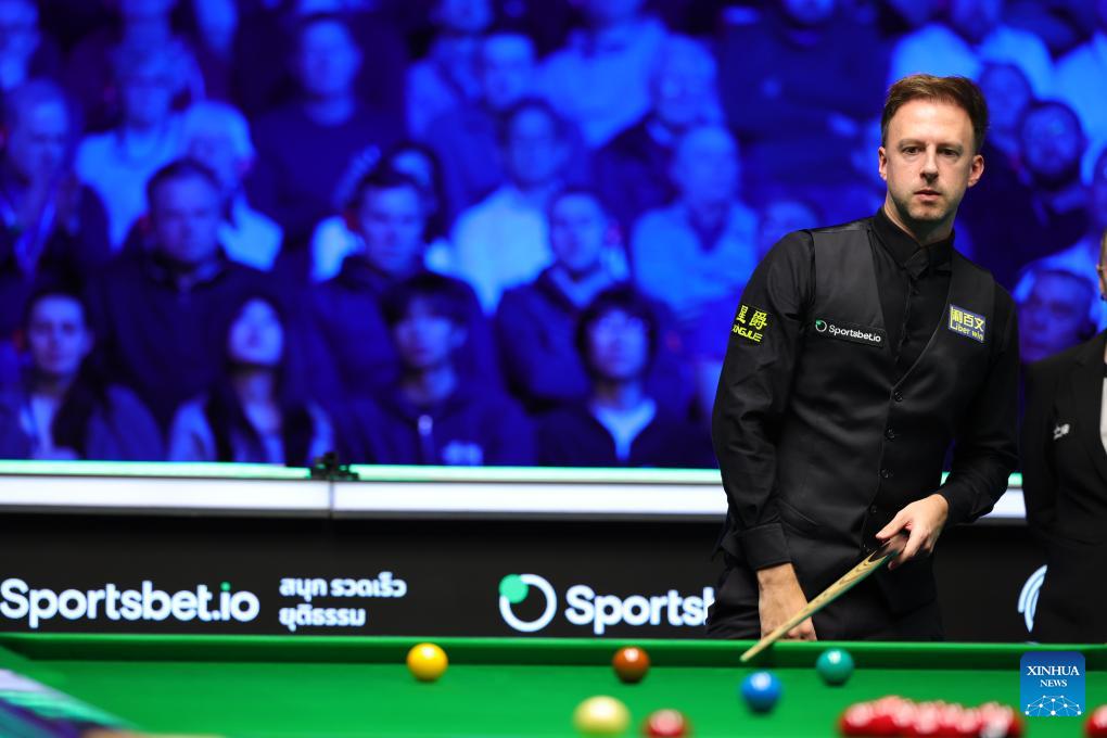 Judd Trump of England competes during the final between Zhao Xintong of China and Judd Trump of England at the 2026 Snooker Tour Championship in Manchester, Britain, April 5, 2026. (Photo by Zhai Zheng/Xinhua)
