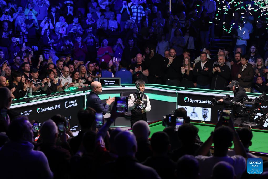 Zhao Xintong of China poses with his trophy during the awarding ceremony after the final between Zhao Xintong of China and Judd Trump of England at the 2026 Snooker Tour Championship in Manchester, Britain, April 5, 2026. (Photo by Zhai Zheng/Xinhua)
