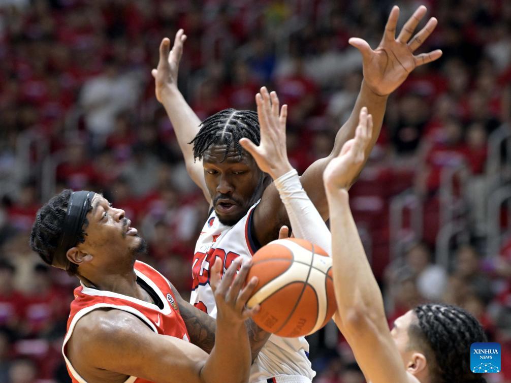 Dominic Gilbert (R) of South China Athletic vies with Tulga Odgerel of XAC Broncos during the 2026 Basketball Champions League Asia-East group phase group B match between South China Athletic and XAC Broncos in Hong Kong, south China, April 6, 2026. (Xinhua/Lo Ping Fai)
