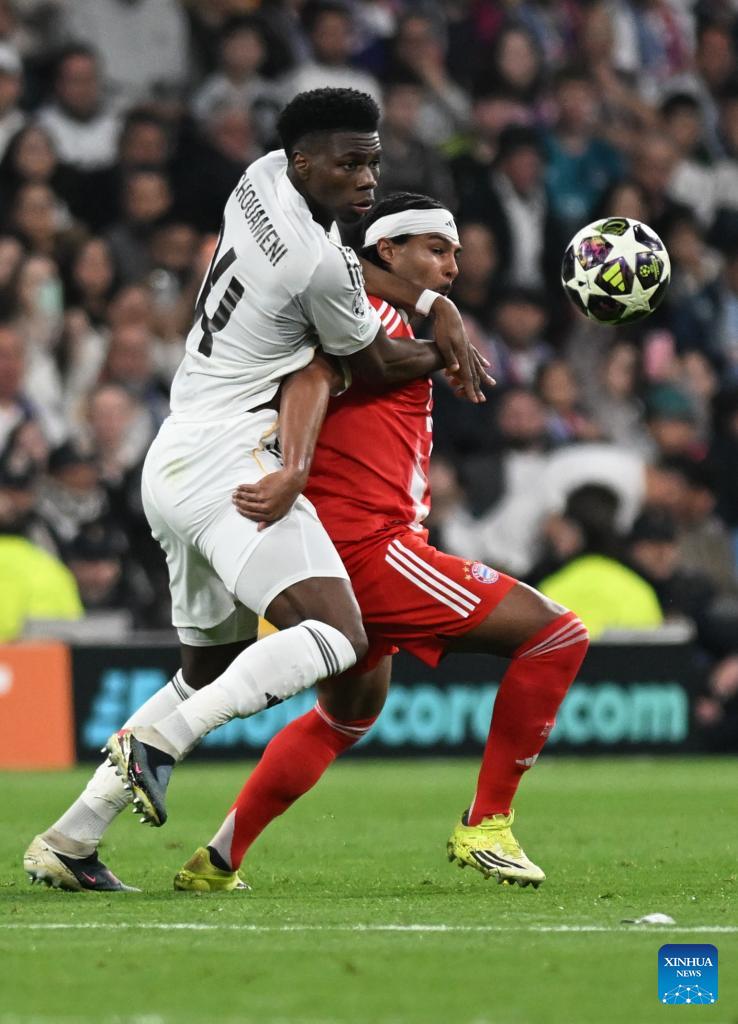 Serge Gnabry (R) of Bayern Munich vies with Aurelien Tchouameni of Real Madrid during the 2025/2026 UEFA Champions League quarterfinal first leg football match between Real Madrid and Bayern Munich in Madrid, Spain, April 7, 2026. (Xinhua/Cheng Min)
