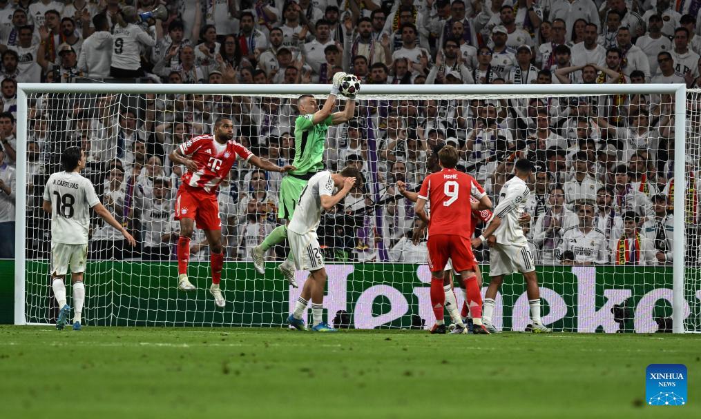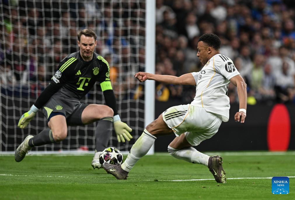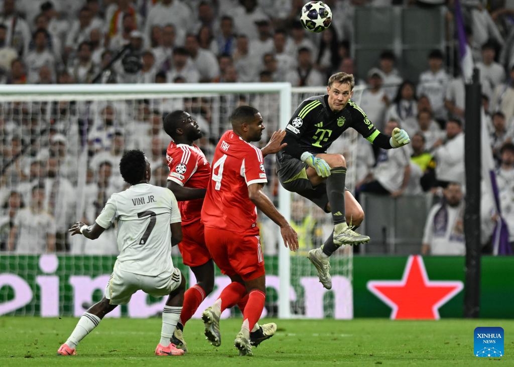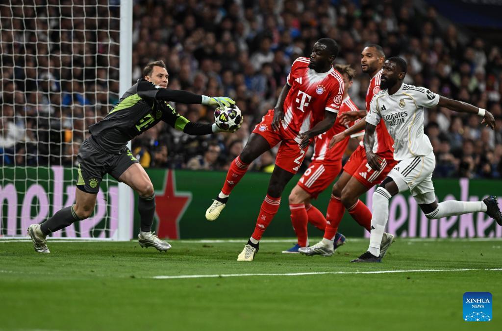 Goalkeeper Manuel Neuer (1st R) of Bayern Munich makes a save during the 2025/2026 UEFA Champions League quarterfinal first leg football match between Real Madrid and Bayern Munich in Madrid, Spain, April 7, 2026. (Xinhua/Cheng Min)