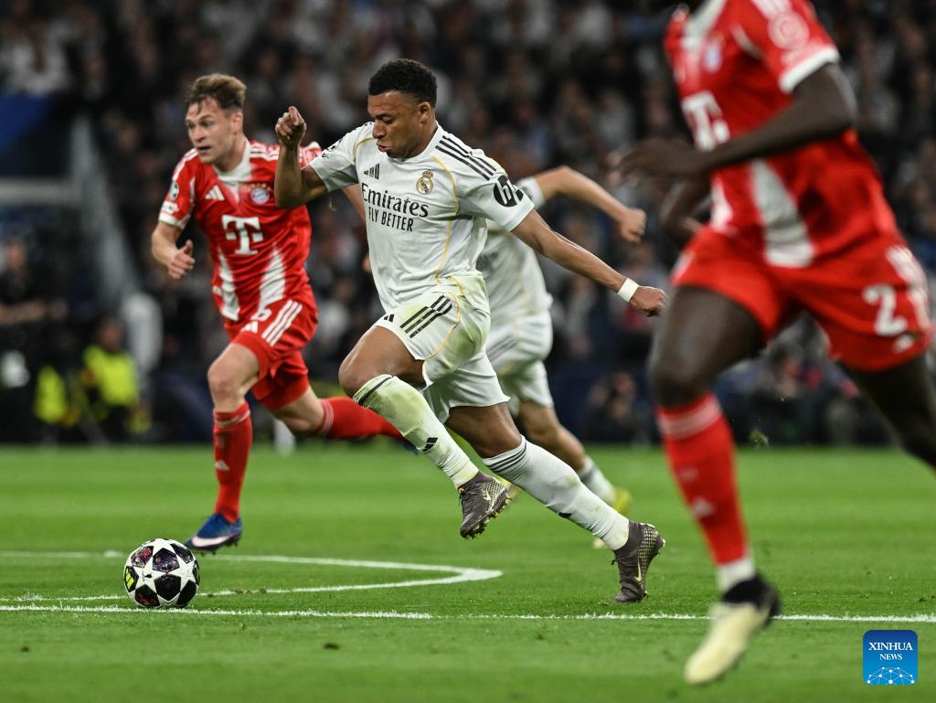 Kylian Mbappe (C) of Real Madrid controls the ball during the 2025/2026 UEFA Champions League quarterfinal first leg football match between Real Madrid and Bayern Munich in Madrid, Spain, April 7, 2026. (Xinhua/Cheng Min)