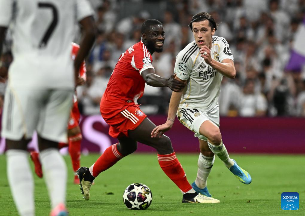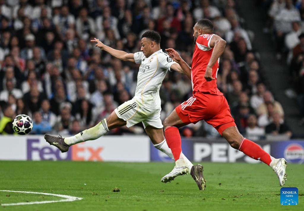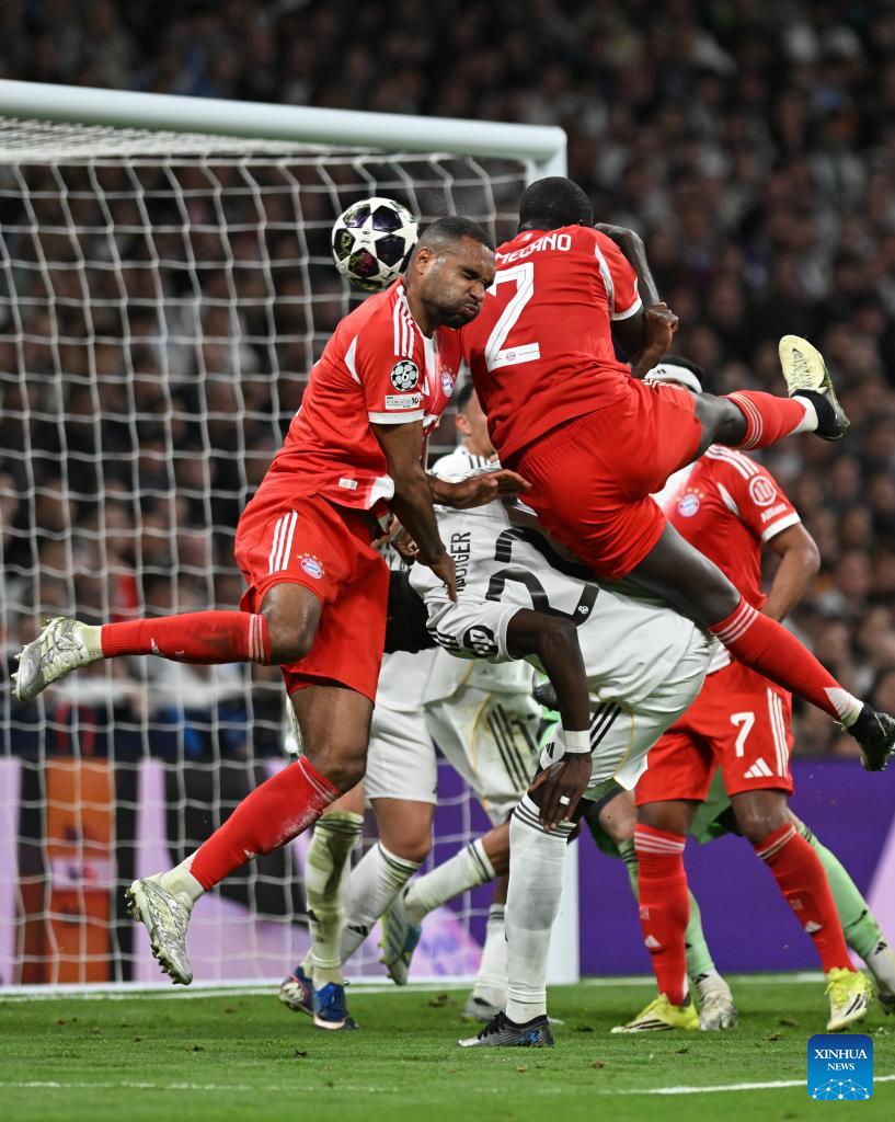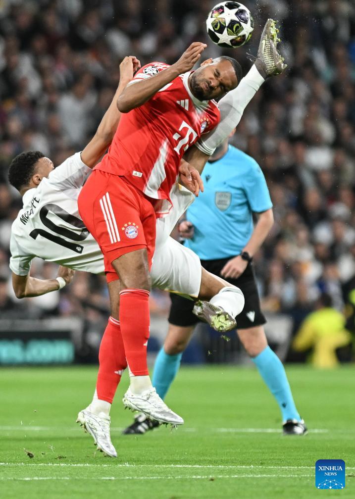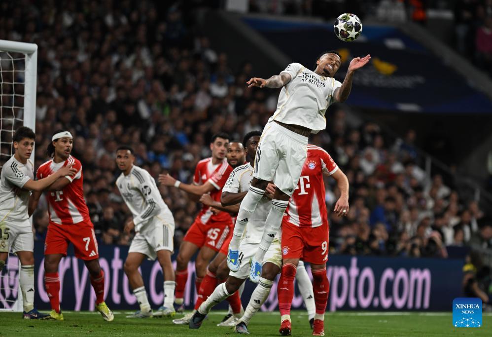 Eder Militao (top) of Real Madrid heads for the ball during the 2025/2026 UEFA Champions League quarterfinal first leg football match between Real Madrid and Bayern Munich in Madrid, Spain, April 7, 2026. (Xinhua/Cheng Min)