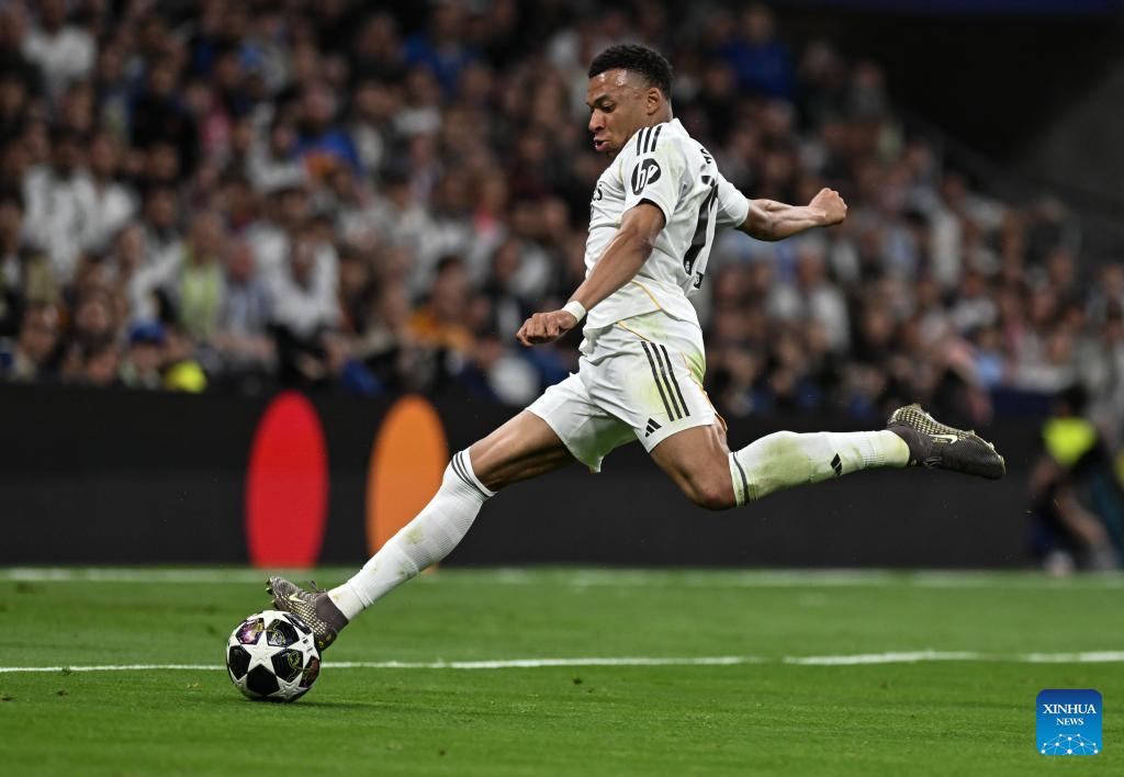 Kylian Mbappe of Real Madrid shoots during the 2025/2026 UEFA Champions League quarterfinal first leg football match between Real Madrid and Bayern Munich in Madrid, Spain, April 7, 2026. (Xinhua/Cheng Min)