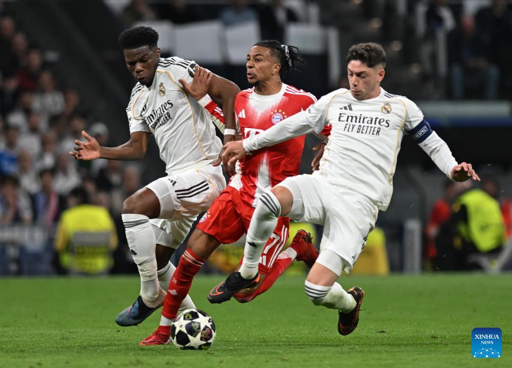 Federico Valverde (C) of Real Madrid controls the ball during the 2025/2026 UEFA Champions League quarterfinal first leg football match between Real Madrid and Bayern Munich in Madrid, Spain, April 7, 2026. (Xinhua/Cheng Min)