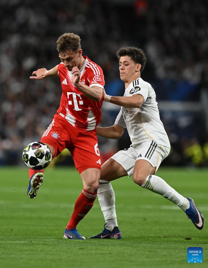 Joshua Kimmich (L) of Bayern Munich vies with Arda Guler of Real Madrid during the 2025/2026 UEFA Champions League quarterfinal first leg football match between Real Madrid and Bayern Munich in Madrid, Spain, April 7, 2026. (Xinhua/Cheng Min)