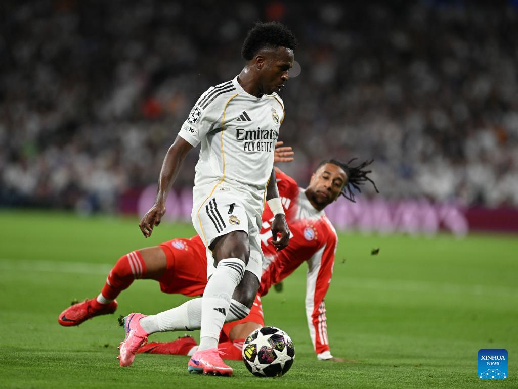 Vinicius Junior (front) of Real Madrid controls the ball against Sacha Boey of Bayern Munich during the 2025/2026 UEFA Champions League quarterfinal first leg football match between Real Madrid and Bayern Munich in Madrid, Spain, April 7, 2026. (Xinhua/Cheng Min)