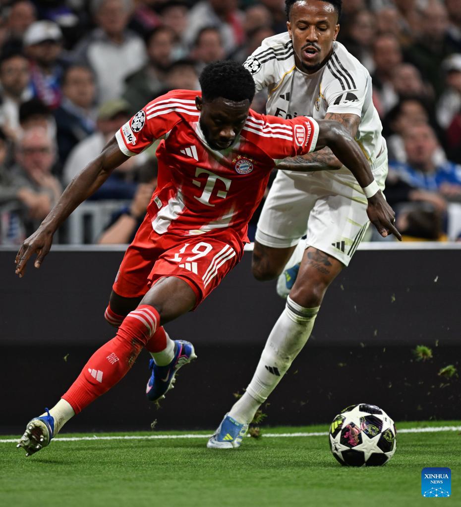 Alphonso Davies (L) of Bayern Munich vies with Eder Militao of Real Madrid during the 2025/2026 UEFA Champions League quarterfinal first leg football match between Real Madrid and Bayern Munich in Madrid, Spain, April 7, 2026. (Xinhua/Cheng Min)
