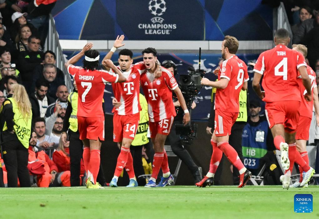 Luis Diaz (2nd L) of Bayern Munich celebrates with teammates after scoring during the 2025/2026 UEFA Champions League quarterfinal first leg football match between Real Madrid and Bayern Munich in Madrid, Spain, April 7, 2026. (Xinhua/Cheng Min)