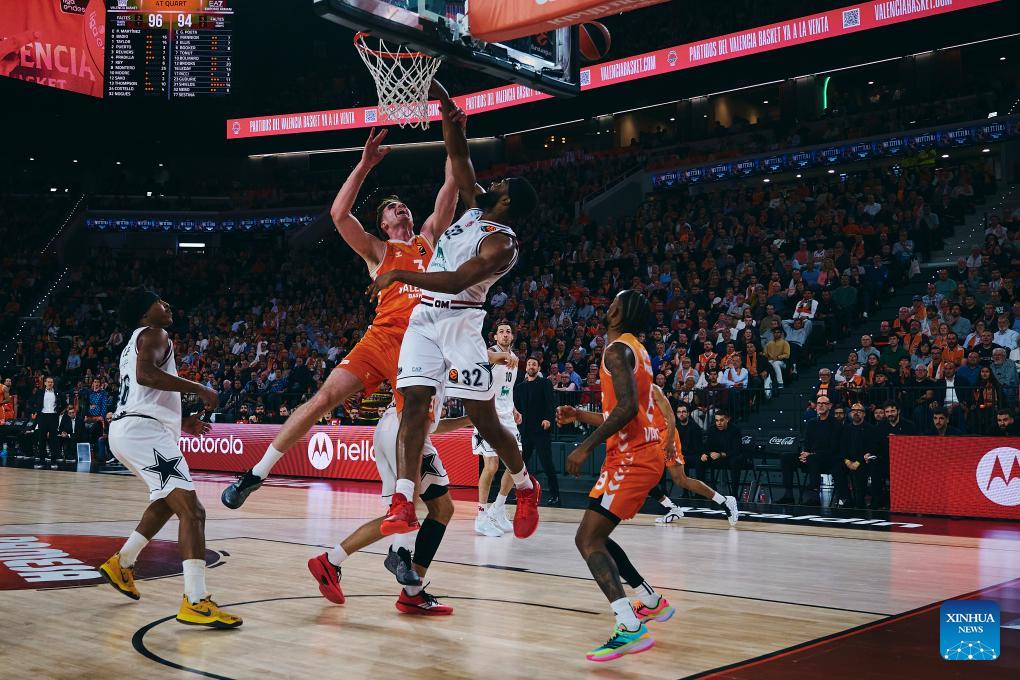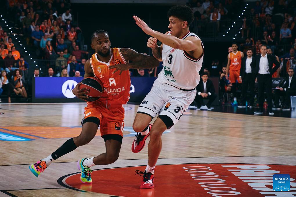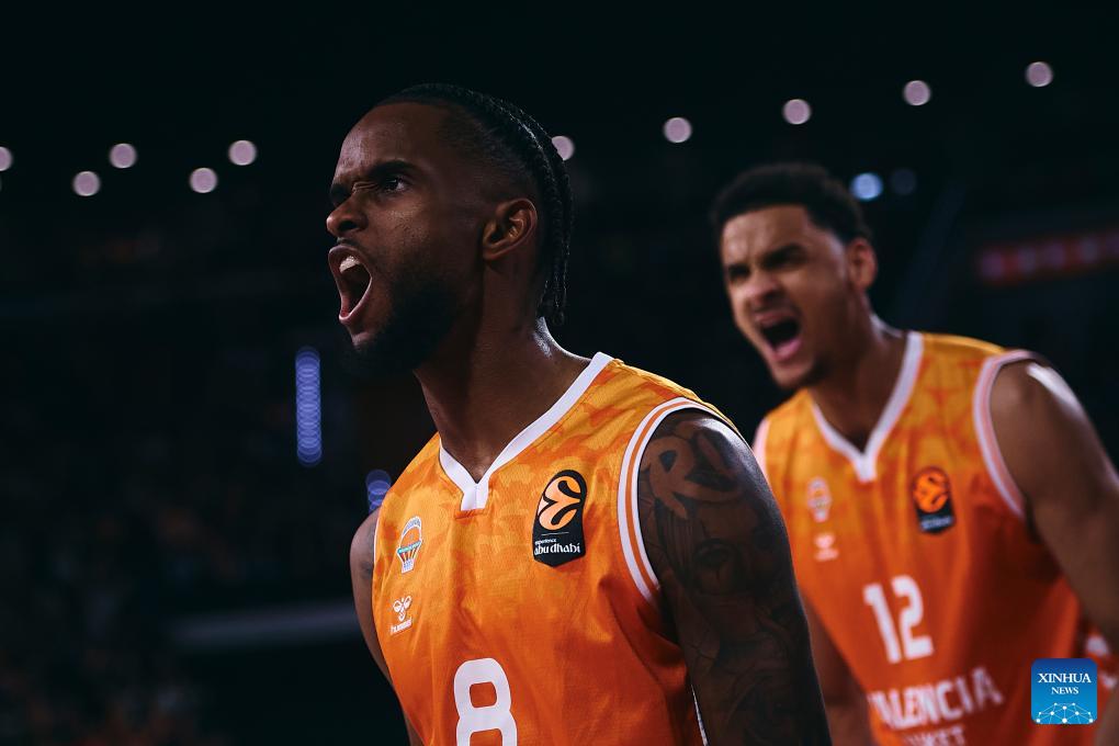 Jean Montero (L) of Valencia celebrates during the Euroleague basketball match between Valencia and EA7 Emporio Armani Milan in Valencia, Spain, on April 7, 2026. (Photo by Pablo Morano/Xinhua)