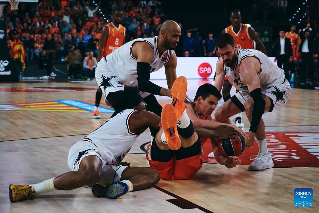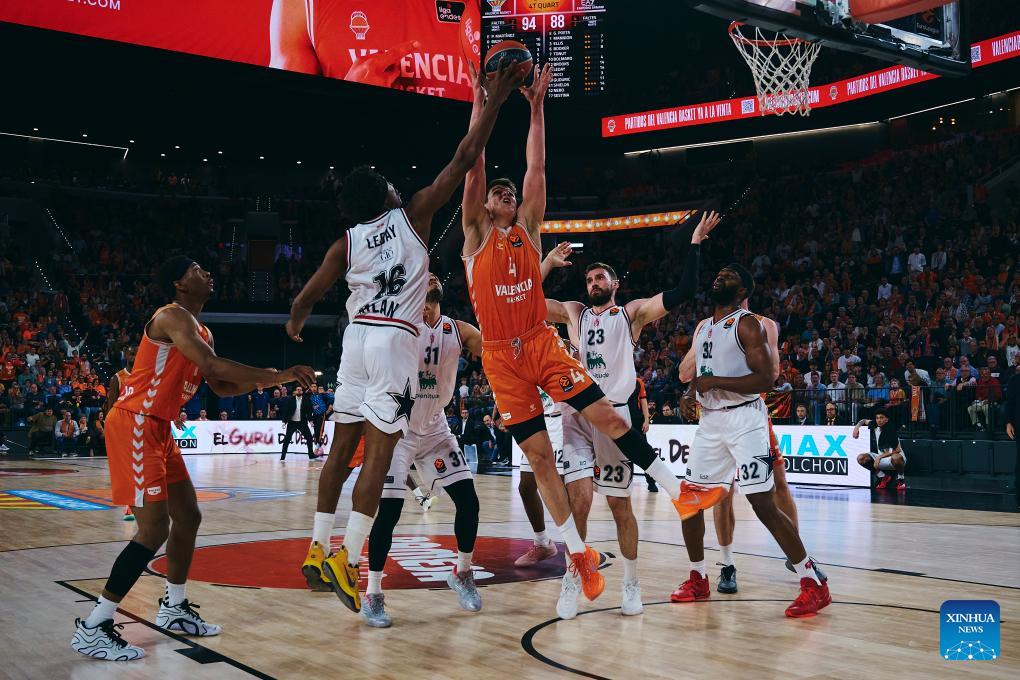 Jaime Pradilla (top R) of Valencia vies for the ball with Zach LeDay (top L) of EA7 Emporio Armani Milan during the Euroleague basketball match between Valencia and EA7 Emporio Armani Milan in Valencia, Spain, on April 7, 2026. (Photo by Pablo Morano/Xinhua)