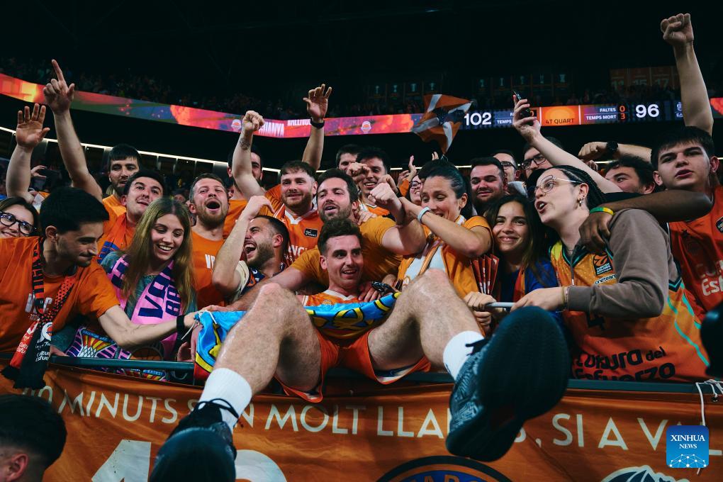 Nate Reuvers of Valencia celebrates after the Euroleague basketball match between Valencia and EA7 Emporio Armani Milan in Valencia, Spain, on April 7, 2026. (Photo by Pablo Morano/Xinhua)