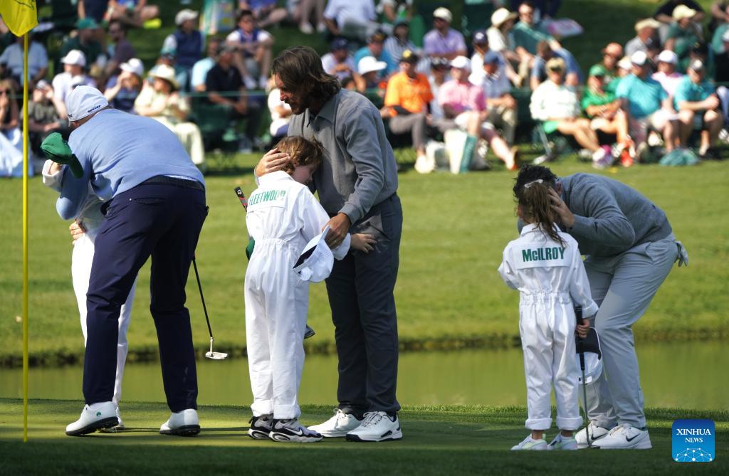 Rory McIlroy (1st R) of Northern Ireland, Tommy Fleetwood (C) of Britain and Shane Lowry (2nd L) of Ireland hug their children during the par 3 contest of the 2026 Masters golf tournament at Augusta National Golf Club, in Augusta, the United States, on April 8, 2026. (Xinhua/Wu Xiaoling)