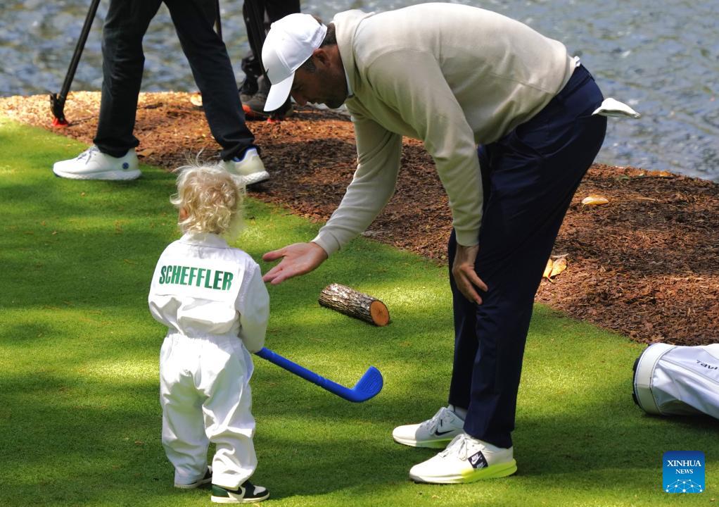 Scottie Scheffler of the United States plays with his son during the par 3 contest of the 2026 Masters golf tournament at Augusta National Golf Club, in Augusta, the United States, on April 8, 2026. (Xinhua/Wu Xiaoling)