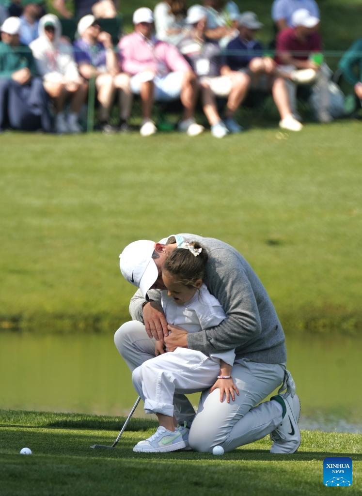 Rory McIlroy of Northern Ireland hugs his daughter during the par 3 contest of the 2026 Masters golf tournament at Augusta National Golf Club, in Augusta, the United States, on April 8, 2026. (Xinhua/Wu Xiaoling)