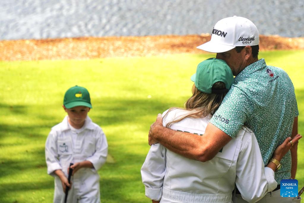 Scottie Scheffler (R) of the United States walk to green with his family during the par 3 contest of the 2026 Masters golf tournament at Augusta National Golf Club, in Augusta, the United States, on April 8, 2026. (Xinhua/Wu Xiaoling)