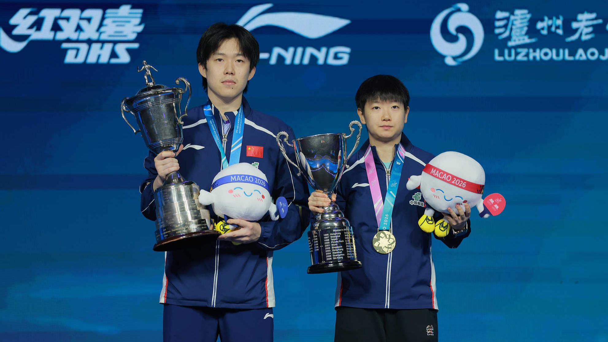 China's Wang Chuqin and Sun Yingsha receive their trophies during the ITTF Men's and Women's World Cup finals at Macau Galaxy Arena, Macau SAR, China, on April 5, 2026. (Photo: VCG)