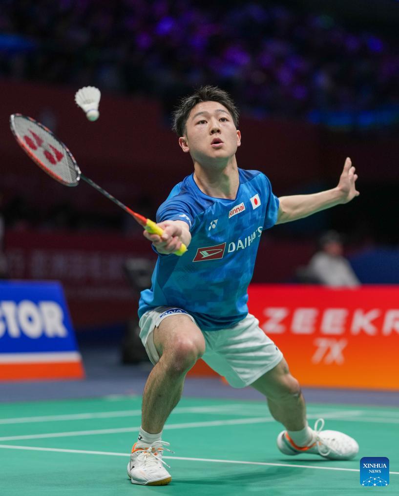 Okimoto Yudai of Japan hits a return during the men's singles round of 16 match against Jonatan Christie of Indonesia at Badminton Asia Championships 2026 in Ningbo, east China's Zhejiang Province, April 9, 2026. (Xinhua/Sun Fei)