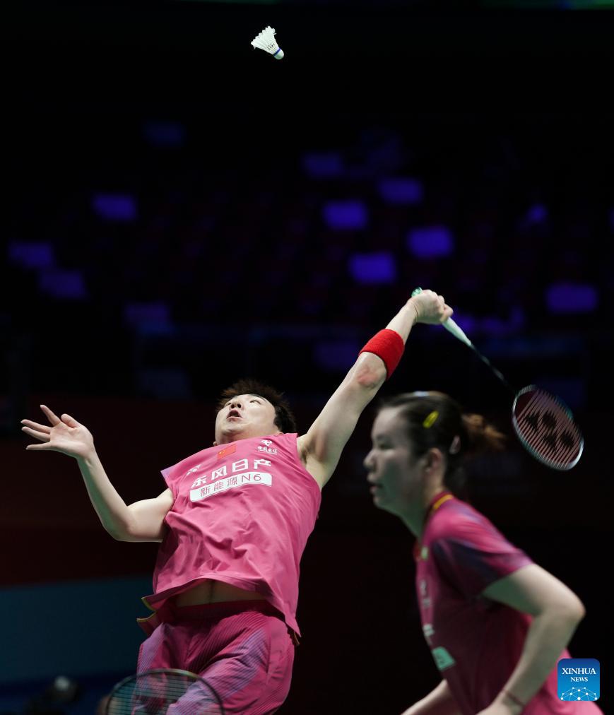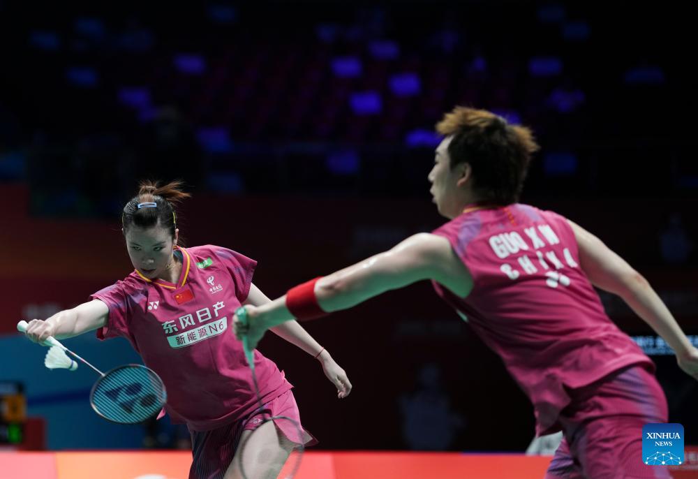 Guo Xinwa (L)/Chen Fanghui of China compete during the mixed doubles round of 16 match against Wong Tien Ci/Lim Chiew Sien of Malaysia at Badminton Asia Championships 2026 in Ningbo, east China's Zhejiang Province, April 9, 2026. (Xinhua/Sun Fei)
