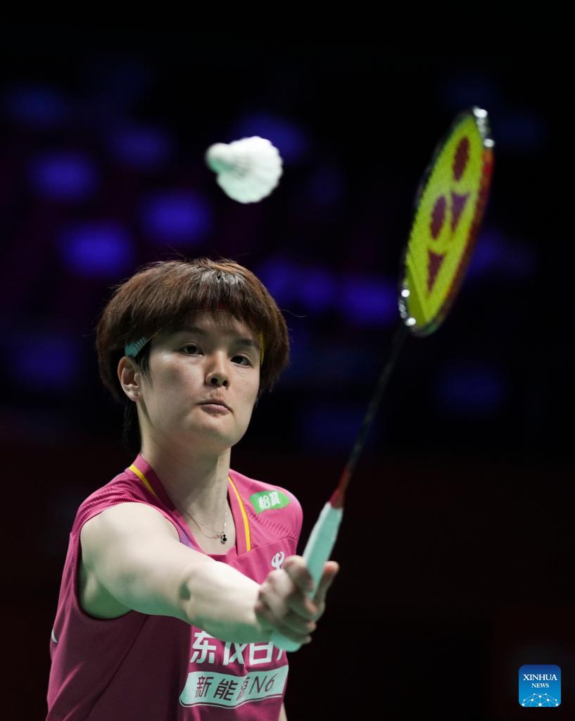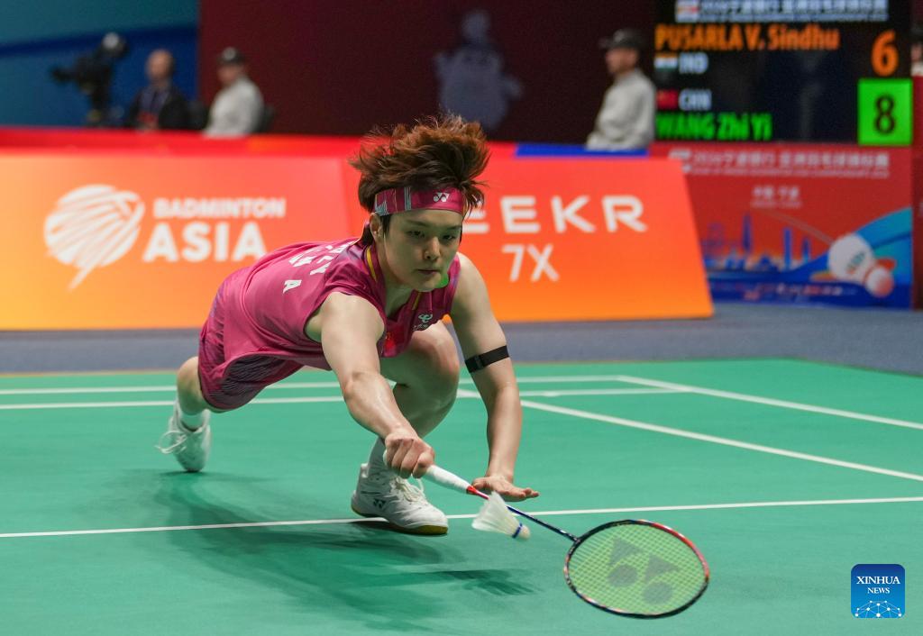 Wang Zhiyi of China hits a return during the women's singles round of 16 match against Pusarla V. Sindhu of India at Badminton Asia Championships 2026 in Ningbo, east China's Zhejiang Province, April 9, 2026. (Xinhua/Sun Fei)