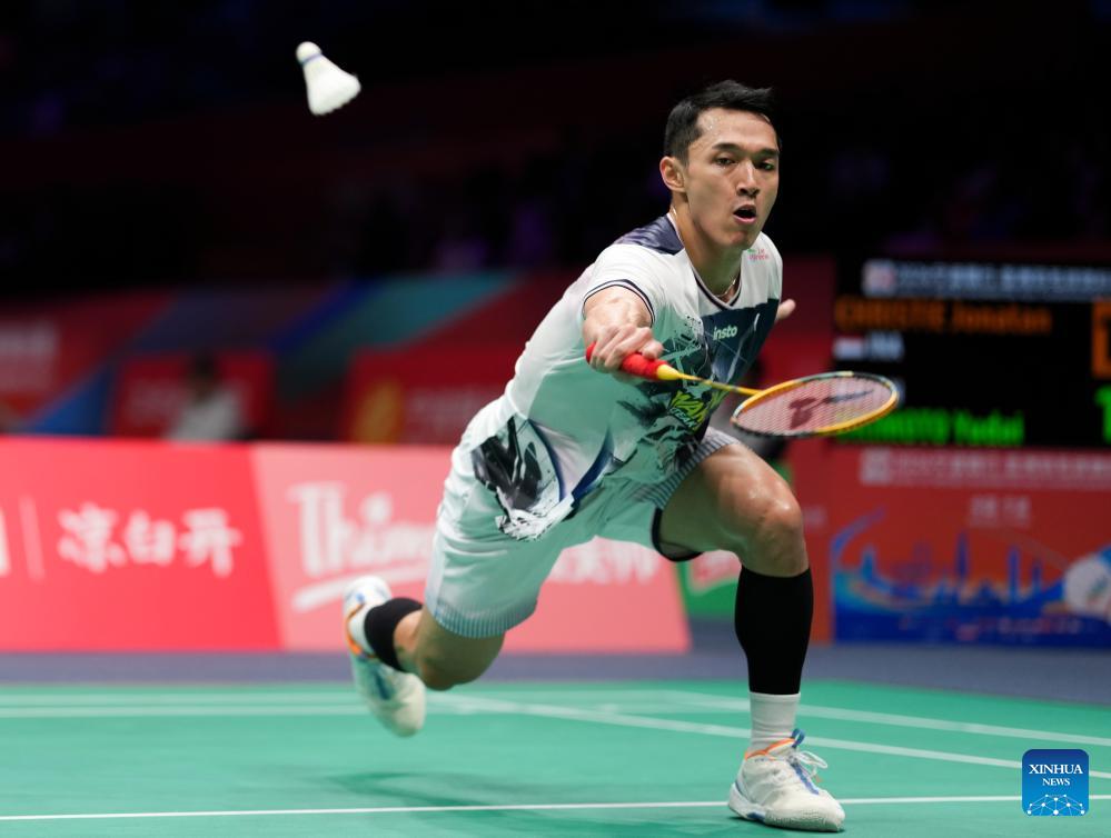 Jonatan Christie of Indonesia hits a return during the men's singles round of 16 match against Okimoto Yudai of Japan at Badminton Asia Championships 2026 in Ningbo, east China's Zhejiang Province, April 9, 2026. (Xinhua/Sun Fei)