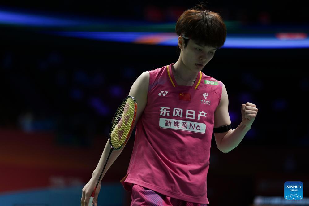 Wang Zhiyi of China celebrates a score during the women's singles round of 16 match against Pusarla V. Sindhu of India at Badminton Asia Championships 2026 in Ningbo, east China's Zhejiang Province, April 9, 2026. (Xinhua/Sun Fei)