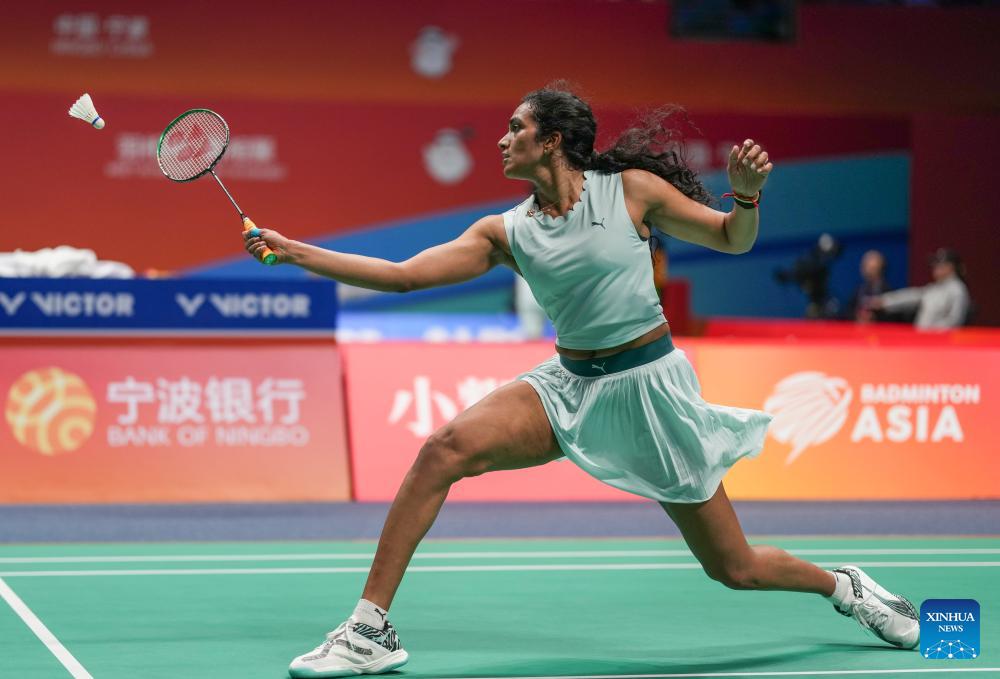 Pusarla V. Sindhu of India hits a return during the women's singles round of 16 match against Wang Zhiyi of China at Badminton Asia Championships 2026 in Ningbo, east China's Zhejiang Province, April 9, 2026. (Xinhua/Sun Fei)