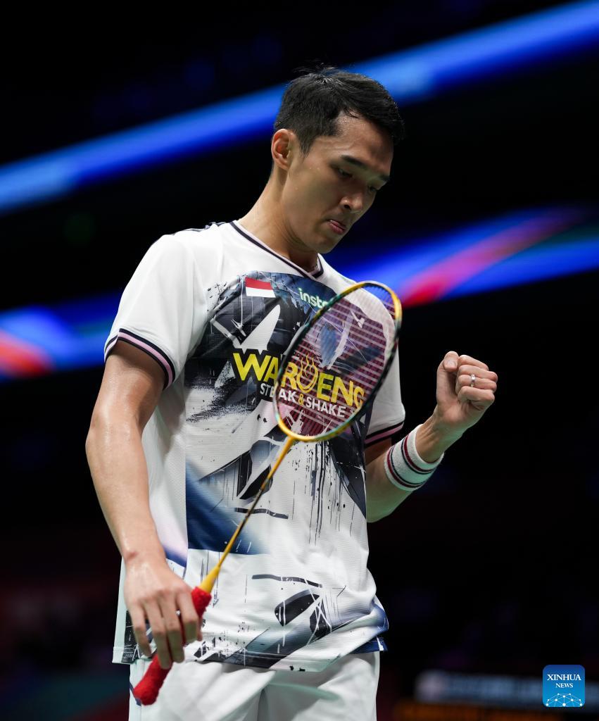 Jonatan Christie of Indonesia celebrates a score during the men's singles round of 16 match against Okimoto Yudai of Japan at Badminton Asia Championships 2026 in Ningbo, east China's Zhejiang Province, April 9, 2026. (Xinhua/Sun Fei)