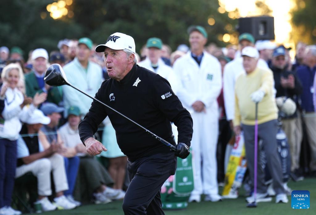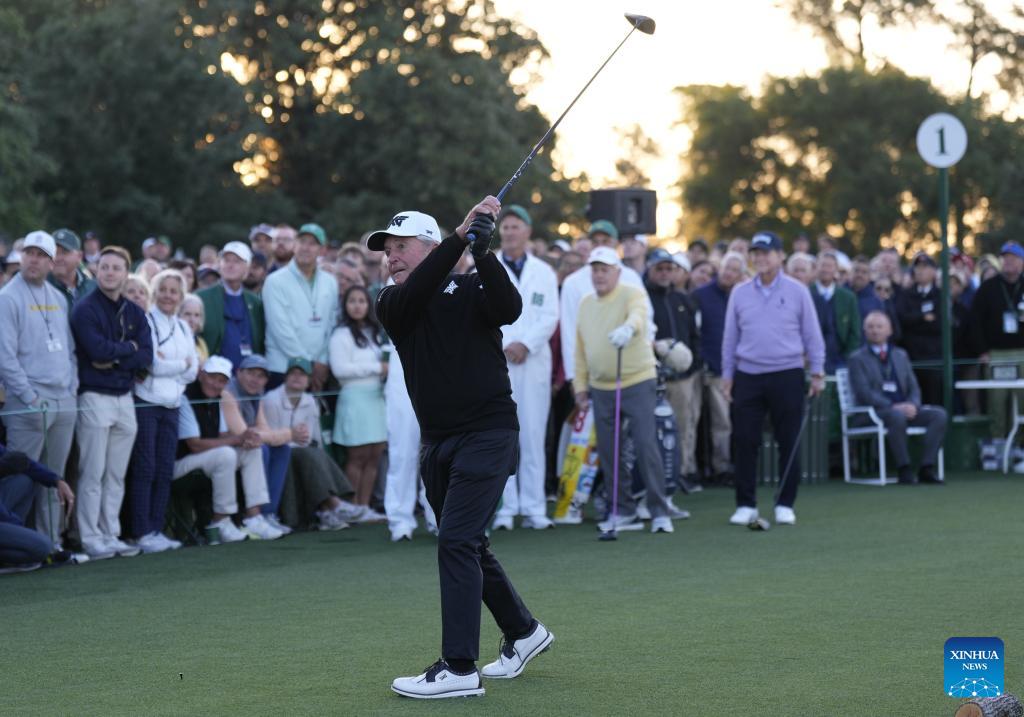Honorary Starter Gary Player of South Africa hits the first tee ceremonially opening the 2026 Masters golf tournament at Augusta National Golf Club, in Augusta, the United States, on April 9, 2026. (Xinhua/Wu Xiaoling)