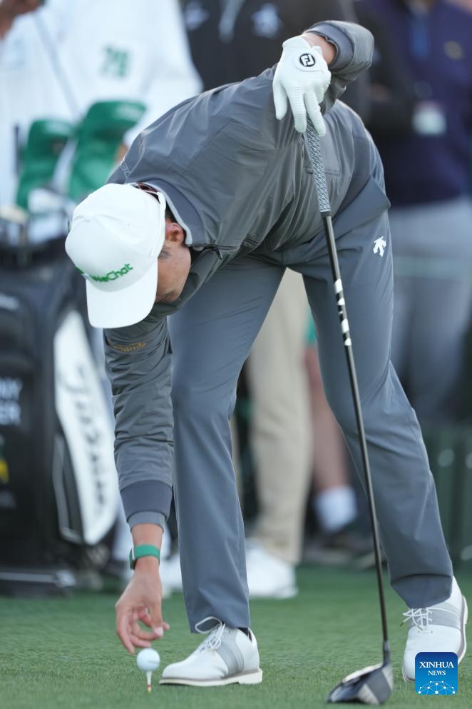 Li Haotong of China places the ball on a tee during the 2026 Masters golf tournament at Augusta National Golf Club, in Augusta, the United States, on April 9, 2026. (Xinhua/Wu Xiaoling)