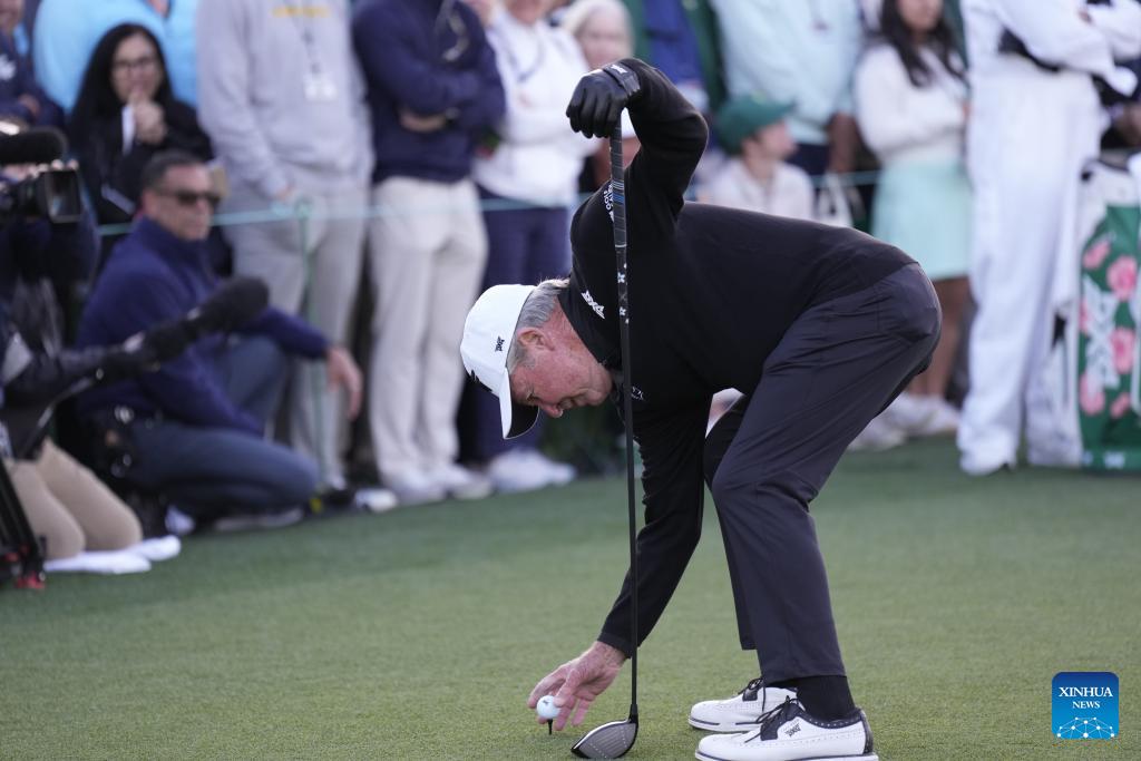 Honorary Starter Gary Player of South Africa places the ball on a tee during the 2026 Masters golf tournament at Augusta National Golf Club, in Augusta, the United States, on April 9, 2026. (Xinhua/Wu Xiaoling)