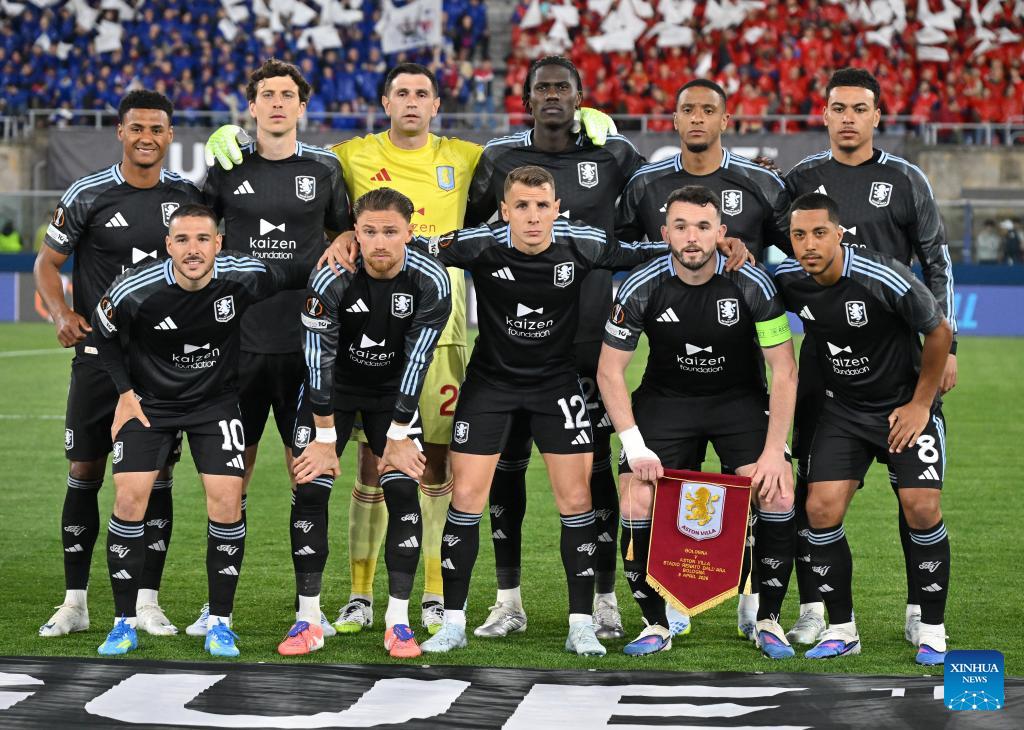 Aston Villa's starting players pose before the Europa League quarterfinal first leg football match between Bologna and Aston Villa in Bologna, Italy, April 9, 2026. (Photo by Alberto Lingria/Xinhua)