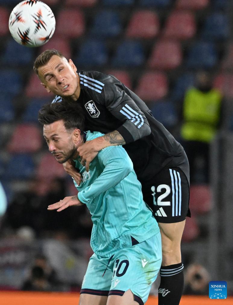 Aston Villa's Ezri Konsa (1st L) scores during the Europa League quarterfinal first leg football match between Bologna and Aston Villa in Bologna, Italy, April 9, 2026. (Photo by Alberto Lingria/Xinhua)
