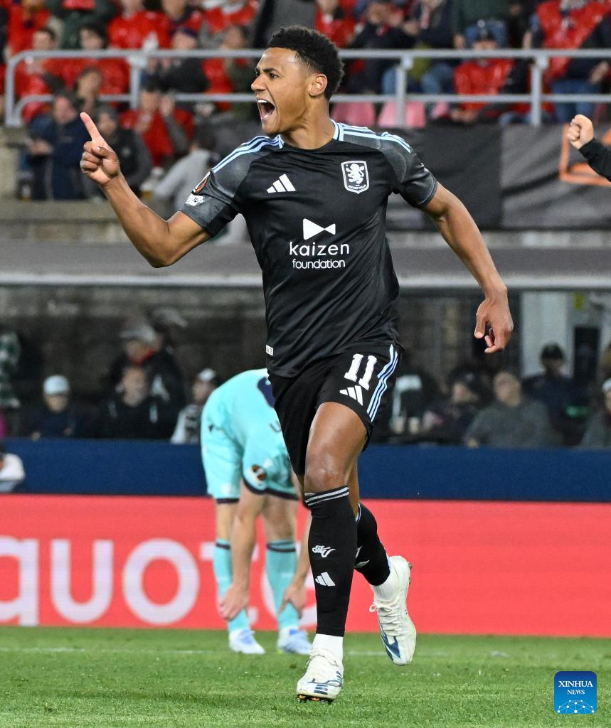 Aston Villa's Ollie Watkins celebrates his goal during the Europa League quarterfinal first leg football match between Bologna and Aston Villa in Bologna, Italy, April 9, 2026. (Photo by Alberto Lingria/Xinhua)