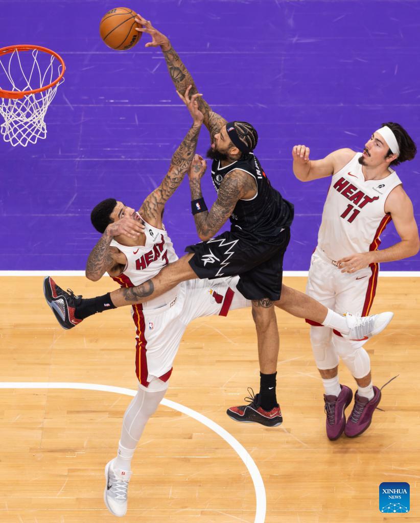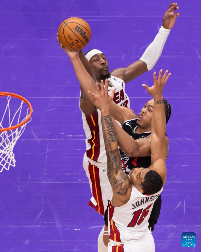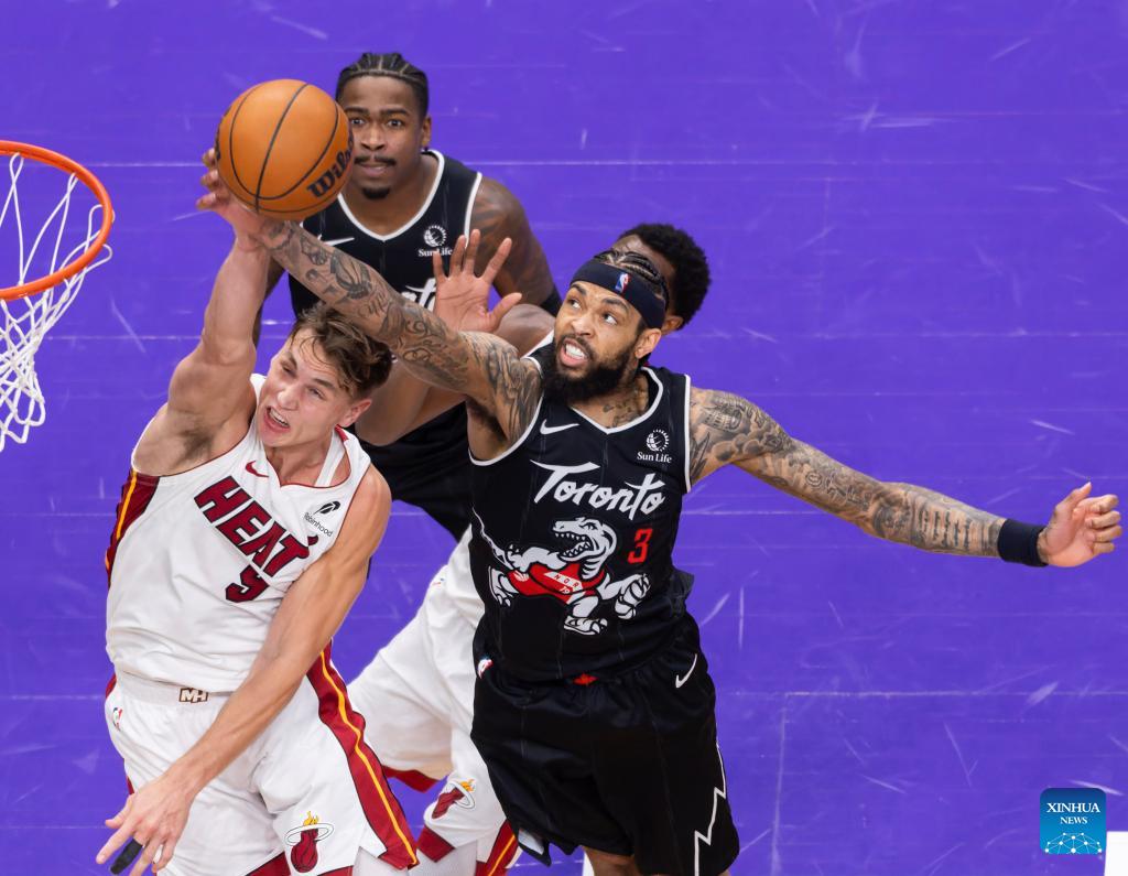 Pelle Larsson (L) of Miami Heat fights for a rebound with Brandon Ingram (R) of Toronto Raptors during the 2025-2026 NBA regular season game between Toronto Raptors and Miami Heat in Toronto, Canada, on April 9, 2026. (Photo by Zou Zheng/Xinhua)