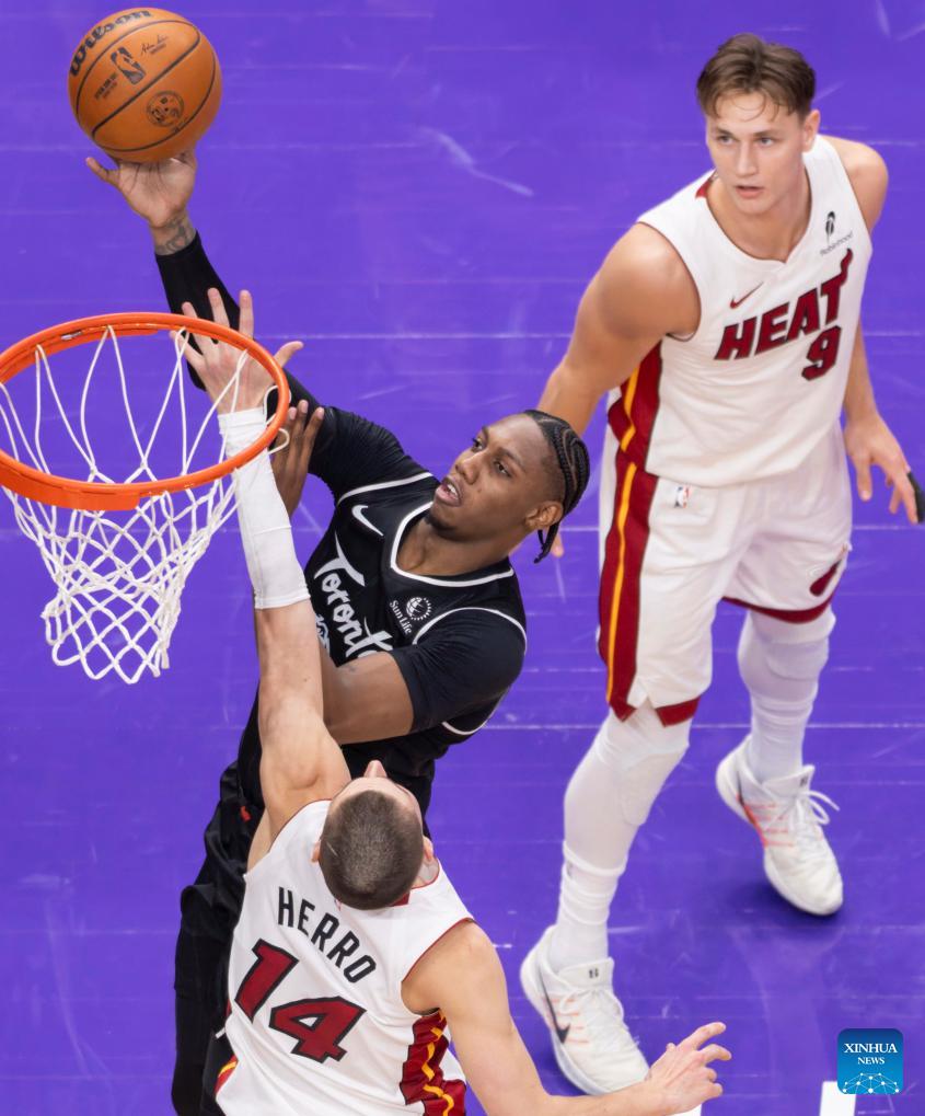 RJ Barrett (C) of Toronto Raptors goes up for a layup during the 2025-2026 NBA regular season game between Toronto Raptors and Miami Heat in Toronto, Canada, on April 9, 2026. (Photo by Zou Zheng/Xinhua)