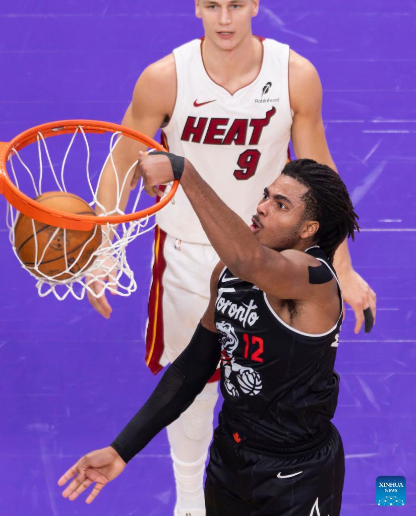 Scottie Barnes (C) of Toronto Raptors goes for a layup during the 2025-2026 NBA regular season game between Toronto Raptors and Miami Heat in Toronto, Canada, on April 9, 2026. (Photo by Zou Zheng/Xinhua)