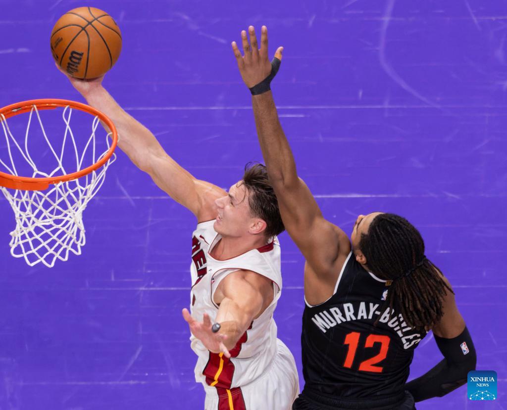 Pelle Larsson (L) of Miami Heat goes up for a layup during the 2025-2026 NBA regular season game between Toronto Raptors and Miami Heat in Toronto, Canada, on April 9, 2026. (Photo by Zou Zheng/Xinhua)