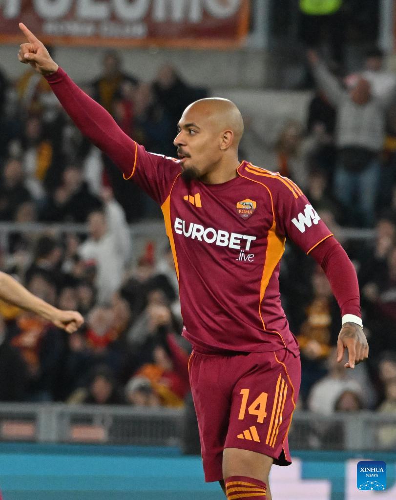 Roma's Donyell Malen celebrates his third goal during a Serie A soccer match between Roma and Pisa in Rome, Italy, April 10, 2026. (Photo by Alberto Lingria/Xinhua)