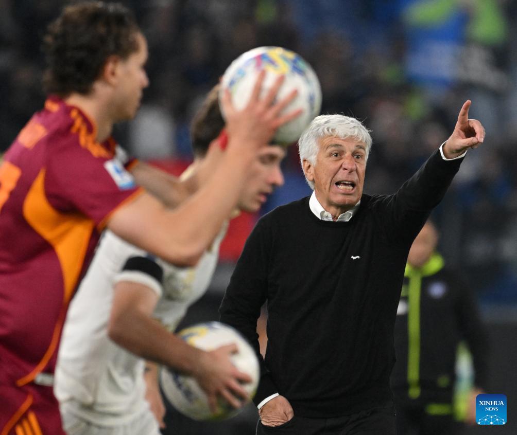 Roma's head coach Giampiero Gasperini (R) gestures during a Serie A soccer match between Roma and Pisa in Rome, Italy, April 10, 2026. (Photo by Alberto Lingria/Xinhua)