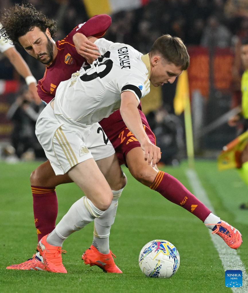 Roma's Mario Hermoso (L) vies with Pisa's Michel Aebischer during a Serie A soccer match between Roma and Pisa in Rome, Italy, April 10, 2026. (Photo by Alberto Lingria/Xinhua)