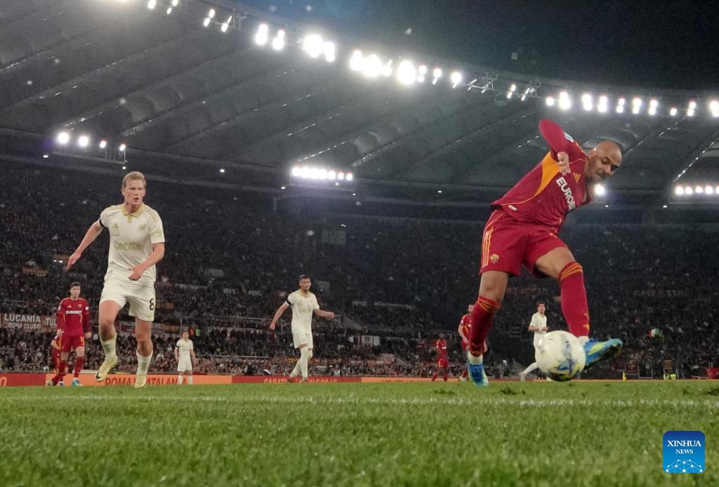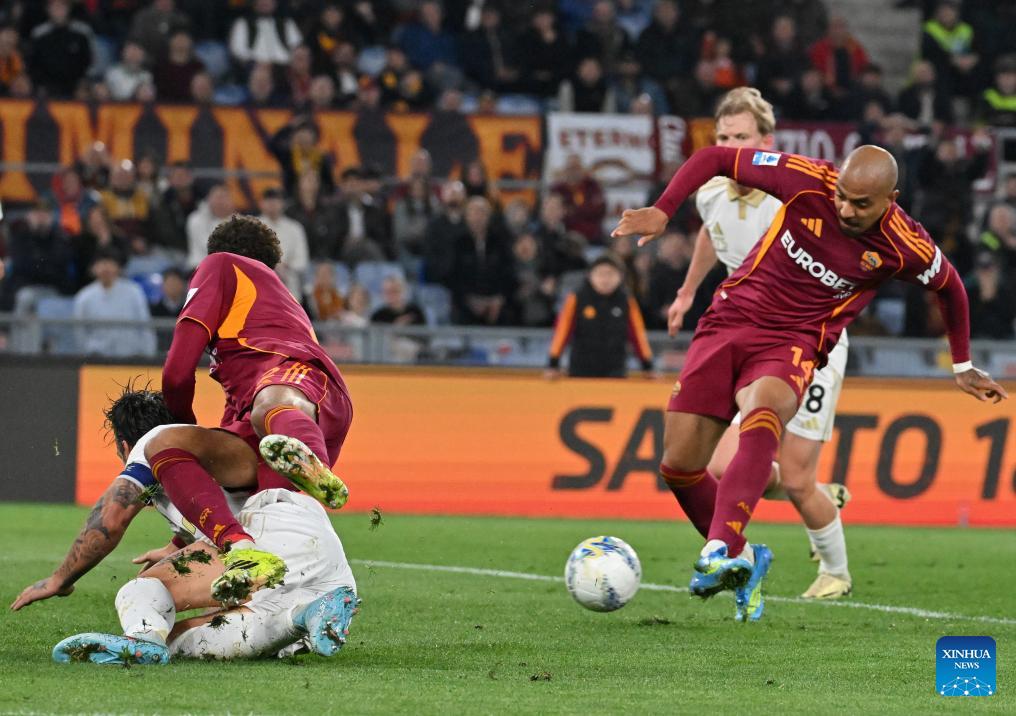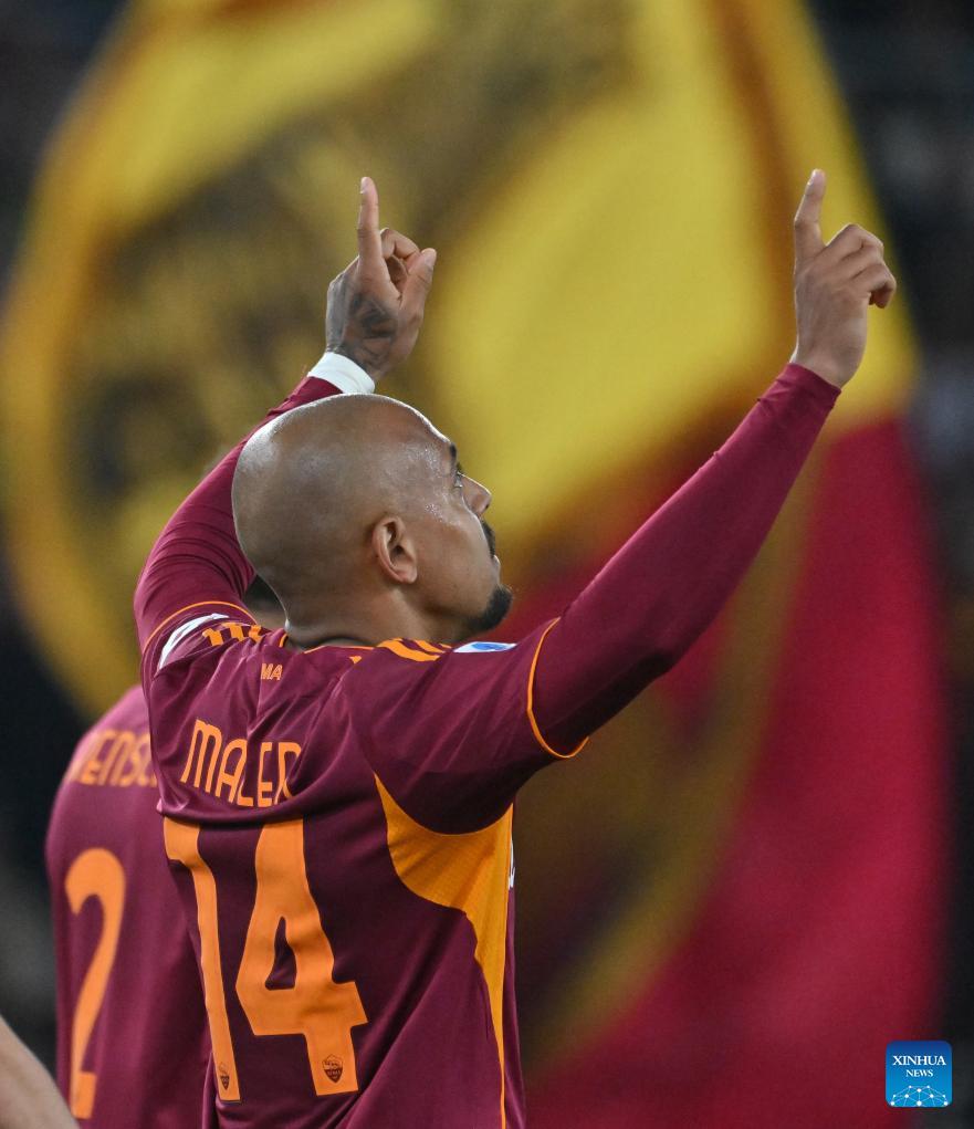 Roma's Donyell Malen (1st R) scores his second goal during a Serie A soccer match between Roma and Pisa in Rome, Italy, April 10, 2026. (Photo by Alberto Lingria/Xinhua)
