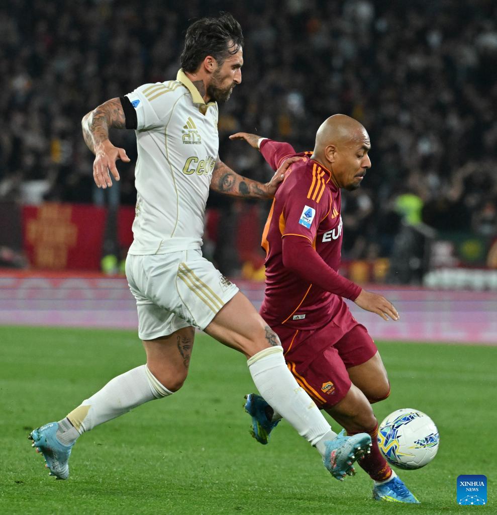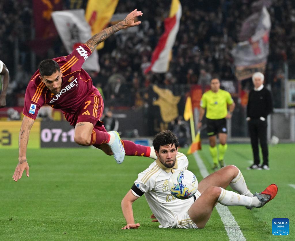 Roma's Lorenzo Pellegrini (L) vies with Pisa's Arturo Calabresi during a Serie A soccer match between Roma and Pisa in Rome, Italy, April 10, 2026. (Photo by Alberto Lingria/Xinhua)